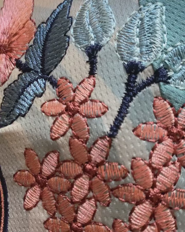 - Technique: High-density floral embroidery using premium threads.
